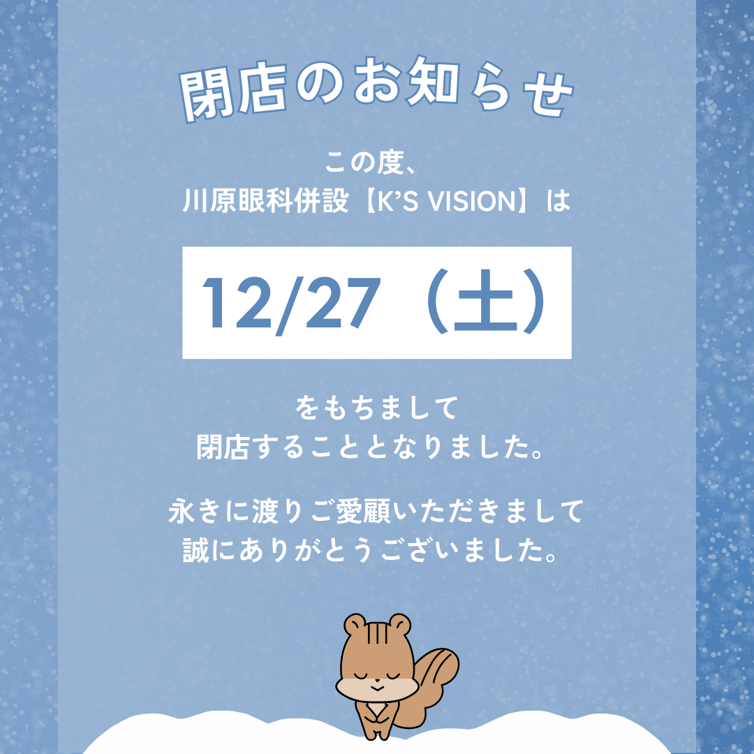 このたび、川原眼科併設【K’S VISION】は2025年12月27日(土)をもちまして完全閉店することとなりました。