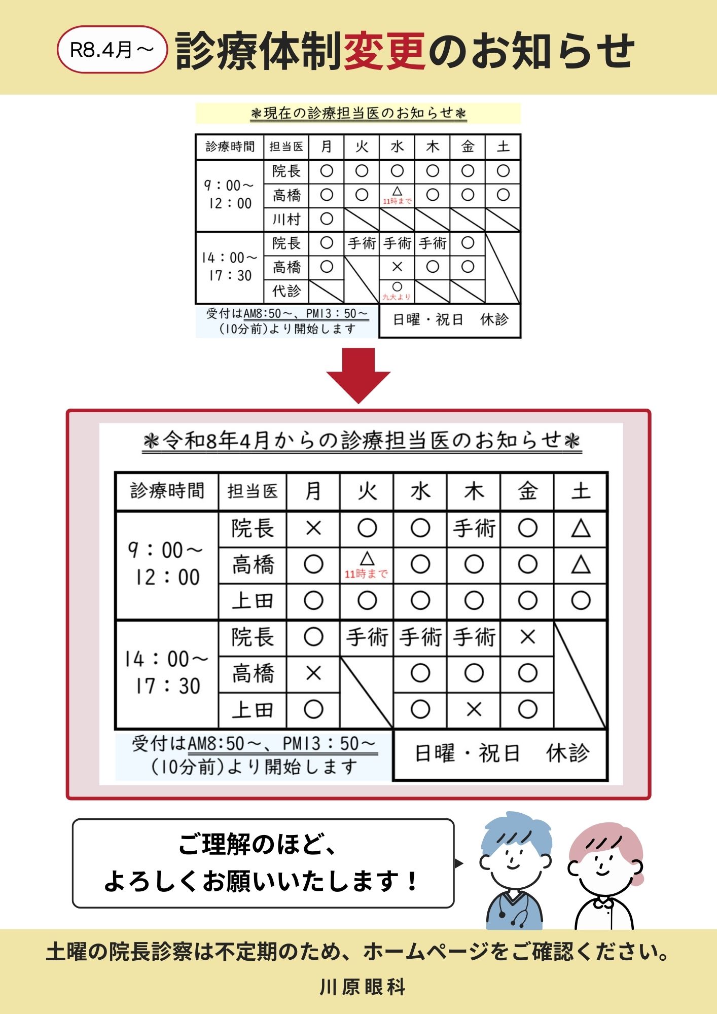 令和8年4月より、医師が3名体制となるため診察スケジュールが変わります。
